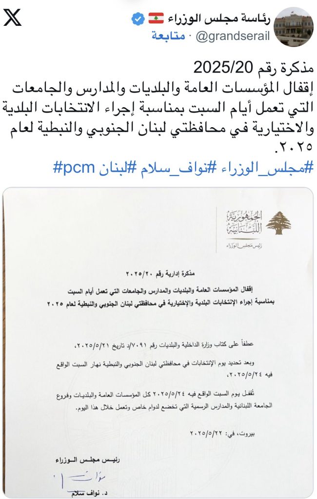 أصدرت رئاسة مجلس الوزراء، اليوم الخميس، مذكرة بإقفال المؤسسات العامة والبلديات والمدارس والجامعات التي تعمل أيام السبت بمناسبة إجراء الانتخابات البلدية والاختيارية في محافظتي لبنان الجنوبي والنبطية لعام ٢٠٢٥ مرفقه بالصورة
