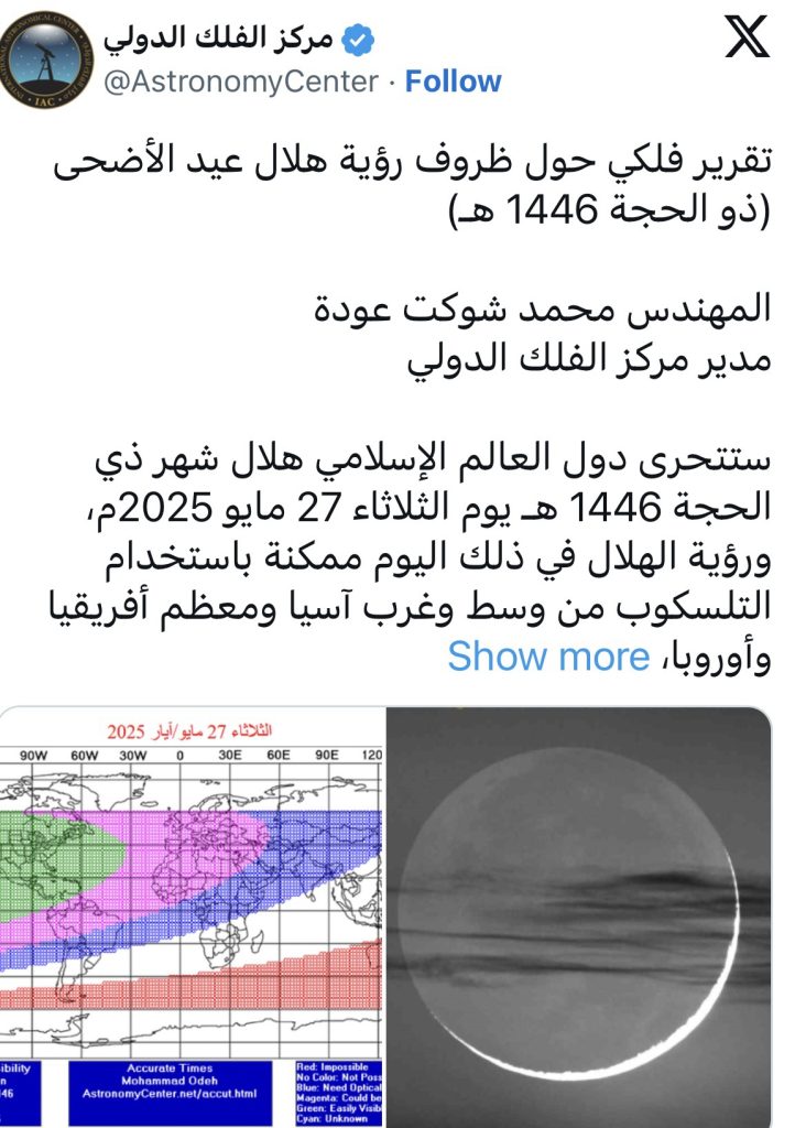 وأضاف: “ستتحرى دول العالم الإسلامي هلال شهر ذي الحجة 1446 هـ يوم الثلاثاء 27 ايار 2025، ورؤية الهلال في ذلك اليوم ممكنة باستخدام التلسكوب من وسط وغرب آسيا ومعظم أفريقيا وأوروبا، وهي ممكنة بالعين المجردة من أجزاء واسعة من القارتين الأميركيتين، وحيث أن هناك إمكانية لرؤية الهلال من العالم الإسلامي، يوم الثلاثاء، فمن المتوقع أن يكون يوم الأربعاء 28 ايار غرة شهر ذي الحجة، وأن يكون يوم الجمعة 6 حزيران أول أيام عيد الأضحى المبارك في معظم دول العالم الإسلامي”.