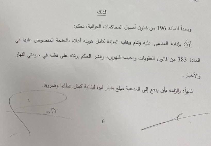 أصدرت القاضي المنفرد الجزائي في بيروت فاطمة جوني حكمًا في الدعوى المقامة على وئام وهاب.قضى الحكم بإدانة وهاب، وسجنه لمدة شهرين، بالإضافة إلى تغريمه مبلغ مليار ليرة لبنانية تعويضاً عن الأضرار المعنوية التي لحقت بالقاضية نتيجة العبارات التي نشرها عبر وسائل التواصل الاجتماعي.