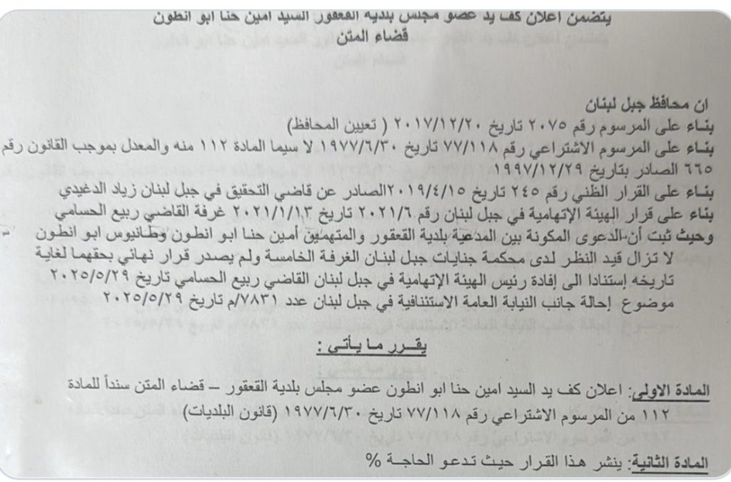 أعلن محافظ جبل لبنان محمد مكاوي كفّ يد رئيس بلدية القعقور طانيوس أبو أنطون وعضو المجلس البلدي أمين حنا أبو أنطون، بسبب دعاوى قانونية لا تزال قيد النظر أمام محكمة جنايات جبل لبنان.