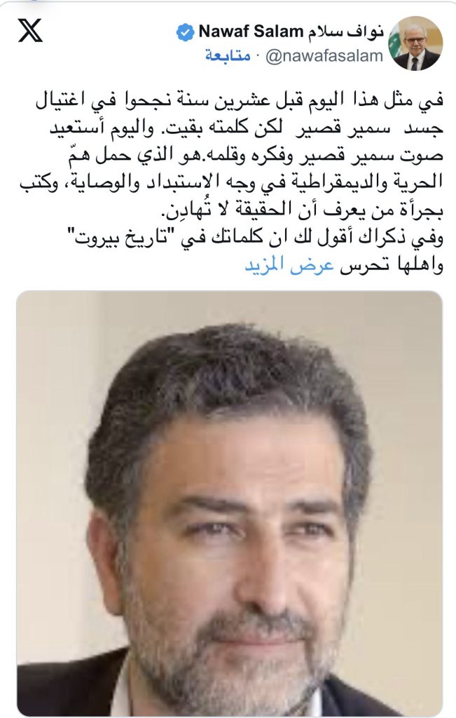 كتب رئيس الحكومة نواف سلام عبر حسابه على منصة “أكس” في ذكرى استشهاد سمير قصير: “في مثل هذا اليوم قبل عشرين سنة نجحوا في اغتيال جسد سمير قصير لكن كلمته بقيت.”