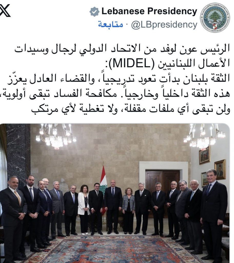 أكد رئيس الجمهورية اللبنانية جوزاف عون خلال استقباله اليوم الإثنين، وفد من الاتحاد اللبناني لرجال وسيدات الأعمال اللبنانيين (MIDEL)، أن الثقة بلبنان بدأت تعود تدريجياً، مشيراً إلى أن القضاء العادل يعزّز هذه الثقة داخلياً وخارجياً.