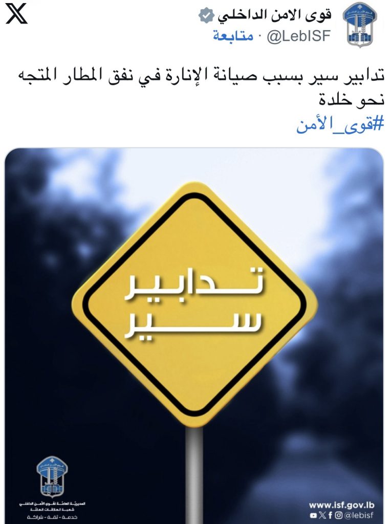 يرجى من المواطنين الكرام أخذ العلم، والتّقيّد بتوجيهات عناصر قوى الأمن الداخلي وإرشاداتهم، وبلافتات السّير التّوجيهيّة، تسهيلًا لحركة المرور.