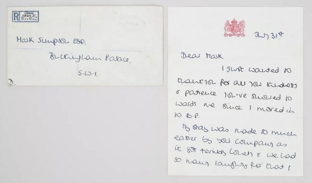 ومن أكثر الأشياء المهمة وأكثر القطع اللافتة للانتباه، رسالة مكتوبة بخط يد الأميرة ديانا بتاريخ 31 تموز 1981، والتي أرسلتها إلى مارك سيمبسون، وهو خادم في قصر باكنغهام، بعد يومين فقط من حفل زفافها الأسطوري الى الأمير تشارلز.