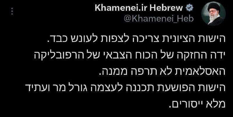 اخبار دوليةعلى مدار الساعة خامنئي باللغة العبرية: “يجب على الكيان الصهيوني أن يتوقع عقابًا شديدًا، فقد خطط لنفسه مصيرًا مريرًا ومستقبلًا مليئًا بالعذاب” يونيو 13, 2025 0 111 FacebookTwitterWhatsApp