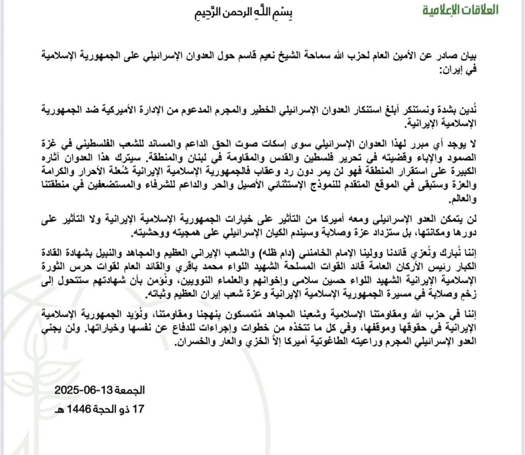 اخبار محليةعلى مدار الساعة *الشيخ نعيم قاسم : العدوان’ على إيران سيترك آثاره الكبيرة على استقرار المنطقة فهو لن يمر دون رد وعقاب* يونيو 13, 2025 0 155 FacebookTwitterWhatsApp الأمين العام لحزب الله الشيخ نعيم قاسم: نُدين بشدة ونستنكر أبلغ استنكار العدوان الإسرائيلي الخطير والمجرم المدعوم من الإدارة الأميركية ضد الجمهورية الإسلامية الإيرانية