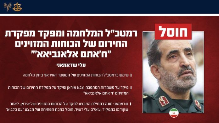 اخبار دوليةعلى مدار الساعة الجيش الاسرائيلي: شادماني كان رئيس أركان الحرب في ايران وأعلى قائد عسكري والأكثر قربًا إلى الزعيم الإيراني علي خامنئي يونيو 17, 2025 0 167 FacebookTwitterWhatsApp