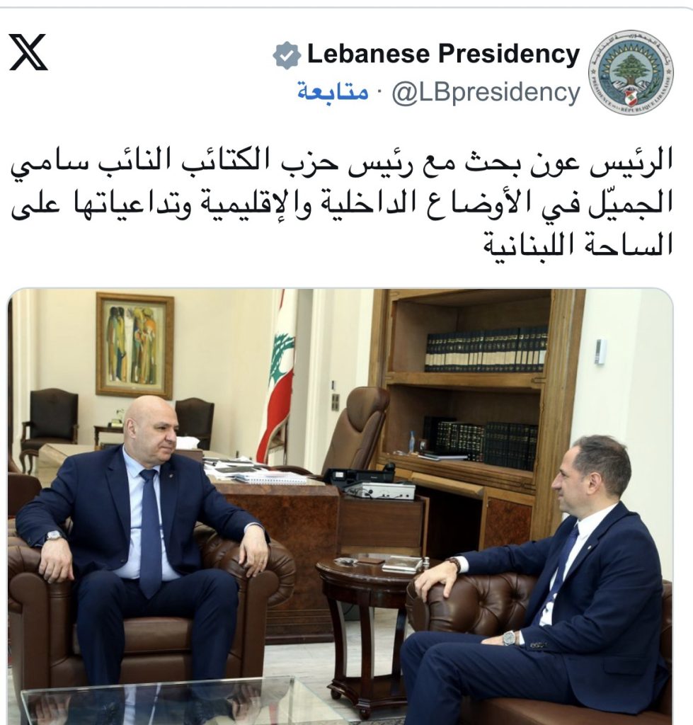 اخبار محليةعلى مدار الساعة *الرئيس عون استقبل رئيس حزب’ الكتائب سامي الجميّل وبحثا في المستجدات السياسية* يونيو 18, 2025 0 135 FacebookTwitterWhatsApp التقى رئيس الجمهورية جوزاف عون رئيس حزب الكتائب النائب سامي الجميّل، اليوم الأربعاء، في قصر بعبدا