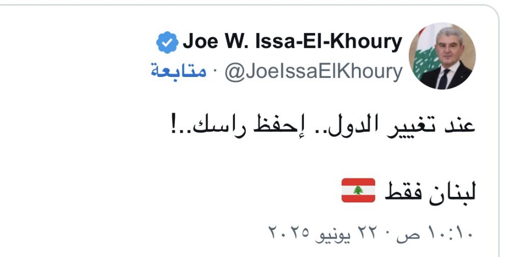 اخبار محليةعلى مدار الساعة *“وزير الصناعة يغرد: عند تغيير الدول… إحفظ راسك! لبنان فقط* يونيو 22, 2025 0 181 FacebookTwitterWhatsApp نشر وزير الصناعة اللبنانية جو عيسى الخوري عبر “إكس”: “عند تغيير الدول.. إحفظ راسك..! لبنانفقط”.