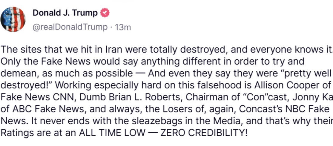 وكتب ترامب عبر حسابه على منصة “تروث سوشال”: “المواقع التي ضربناها في إيران دُمّرت بالكامل، والجميع يعلم ذلك. وحدها الصحافة المزيفة تقول غير ذلك في محاولة للتقليل من الأمر قدر الإمكان وحتى هم قالوا إنها ‘دُمّرت بشكل جيد جدًا!’”.